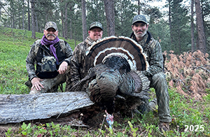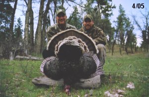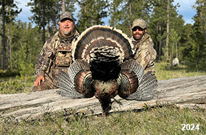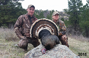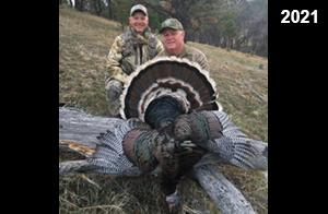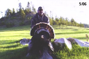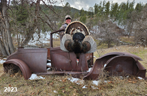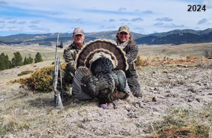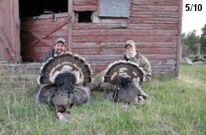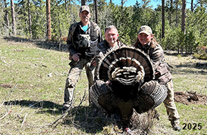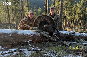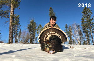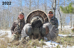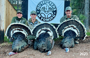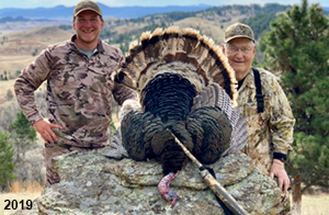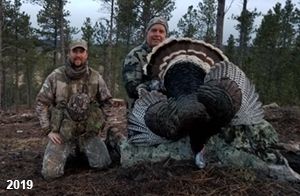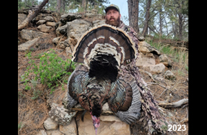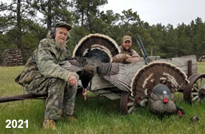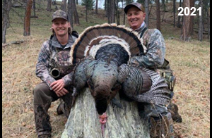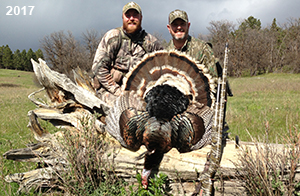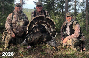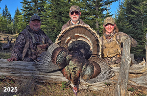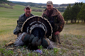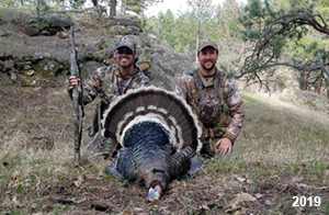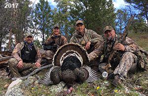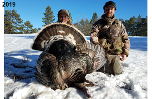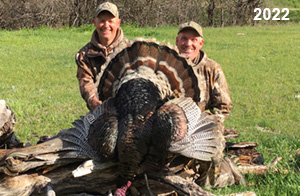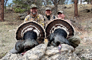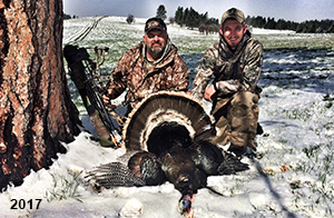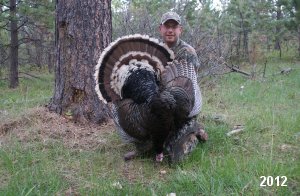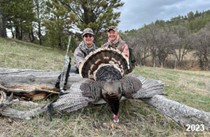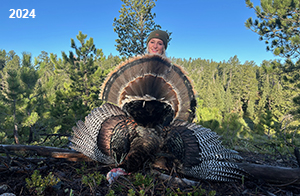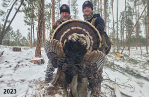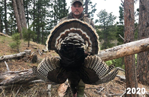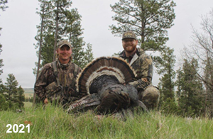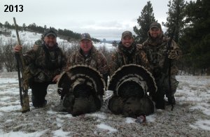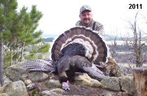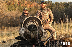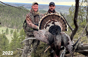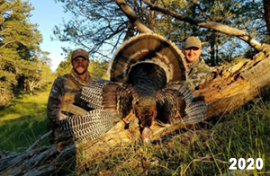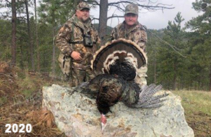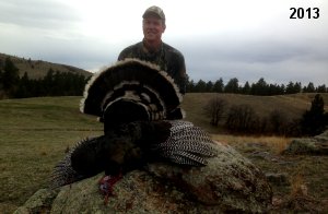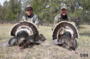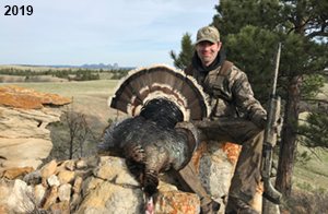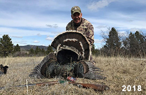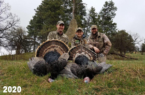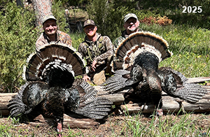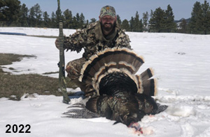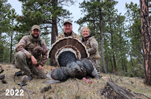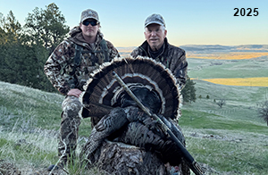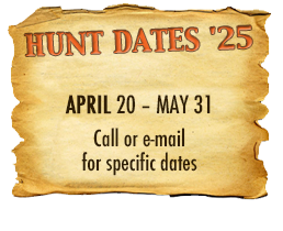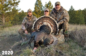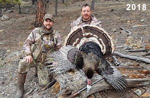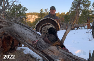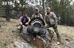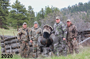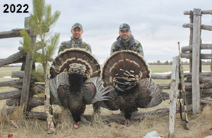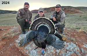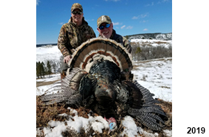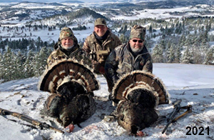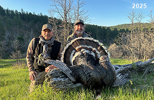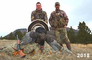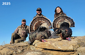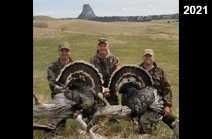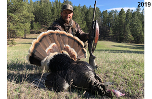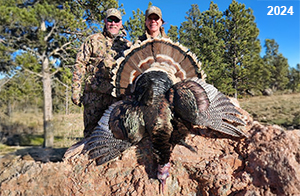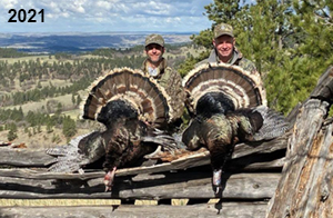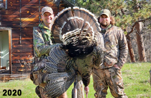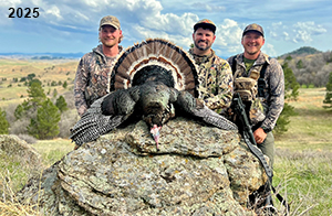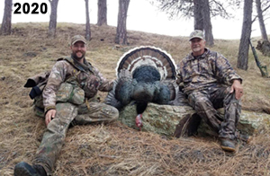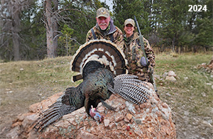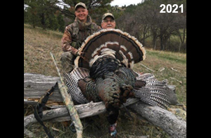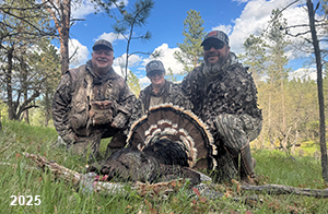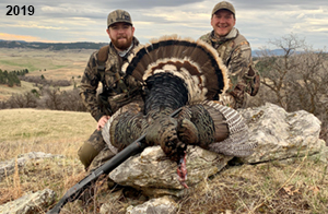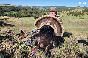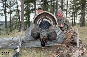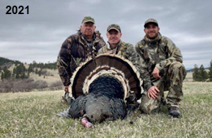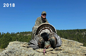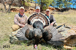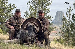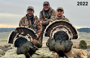 Spring Turkey Our season runs April 20 through May 31. Hunts are three days for single-bird hunts and four days for two-bird hunts. Call or e-mail for specific dates. We assist with obtaining the licenses in Wyoming and South Dakota. Licenses will be at the Lodge when you arrive in the Spring. Over the past 30 years our hunters have had excellent success on long-bearded birds. Our big leases hold excellent numbers of Merriams. Combined with very little hunting pressure, this makes for excellent calling opportunities on mature gobblers. 2025 was an amazing spring turkey season! We took 84 turkey hunters who harvested 76 Merriam Toms. However, shooting opportunity was 98% for our hunters this spring. Out of our 84 turkey hunters, 32 chose to hunt the second Meriam option. Twenty-two of these hunters were successful in harvesting their second Merriam Tom. We have had excellent hatches over the past three years, and we anticipate another outstanding season in 2026. Our 2024 season went awesome! We took 90 hunters who harvested 72 Merriam Toms. 43 of these hunters hunted the second bird in South Dakota. 30 of these harvested a second gobbler. With the excellent hatches the past couple of years, we had an extraordinary amount of jakes this spring. With the overabundance of jakes grouped up, this caused the mature gobblers to gobble much less than normal. We anticipate, after seeing the number of jakes, an exceptional turkey season in Spring 2025. The 2023 season was very successful. We took 92 hunters who harvested 86 Merriam Toms. 34 of the hunters hunted the second bird in South Dakota. 26 of them harvested a second gobbler. The 2024 season looks very promising due to really good hatches in the last few years and really great numbers of jakes that were around during this past 2023 season. The 2022 season went great! We took 88 hunters who harvested 84 Merriam Toms. 44 of these hunters chose to do the second bird hunt in South Dakota. 19 of these harvested a second gobbler. Our 2021 season went well. Because of the virus and 2020 season rollover, we took in the most hunters we've ever had. 95 hunters harvested 88 birds in Wyoming. Hunters who chose to hunt the second bird in South Dakota were around 50% harvest. Throughout the season, we saw large numbers of jakes. The 2020 season was a bit challenging. Due to the virus restrictions, we cancelled the April hunts and all April hunters were given the opportunity to move into 2021 or come in May. We were able to hunt 46 hunters in May. These hunters harvested 42 mature Merriam toms. 35 of these hunters were on the two-bird combo, and 28 of them were able to harvest the second bird. The 2019 season had good success considering cold snowy conditions throughout most of the season. 88 hunters harvested 78 mature toms. 57 of the hunters chose to hunt the second bird; they harvested 41 toms. There were A LOT of missed birds this year, over 50. Although we had poor weather in May, it got better at the end of the month and we ended up with a tremendous hatch. 2018 spring turkey season was awesome! We had 82 turkey hunters and harvested 78 birds. 55 of these hunters chose the two-bird hunt. 48 of them harvested their second Merriam tom. Again, this year we had over 50 misses. We are seeing a lot of jakes and had another good hatch. |