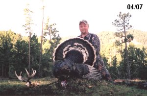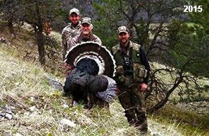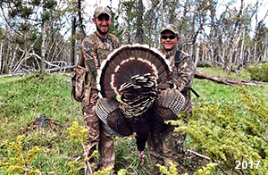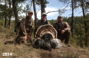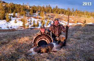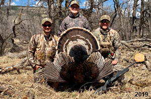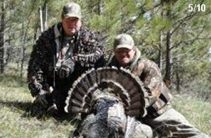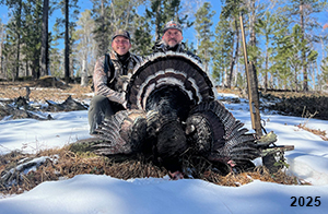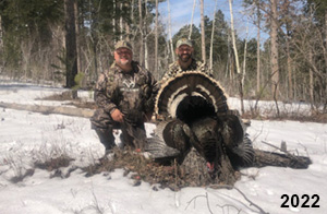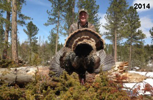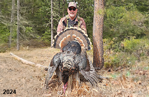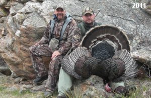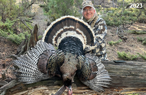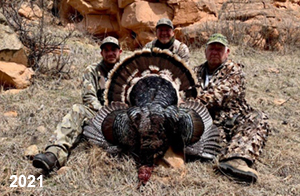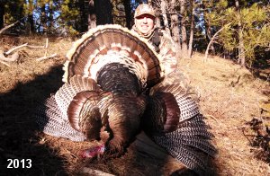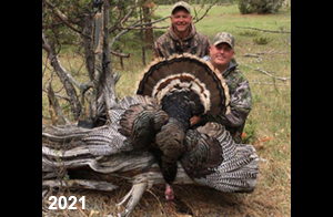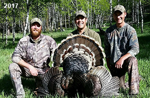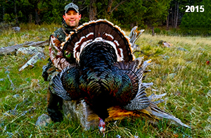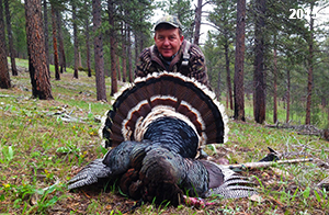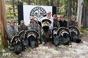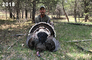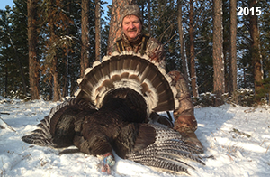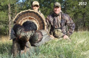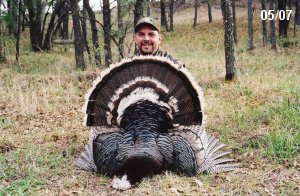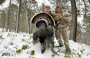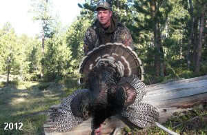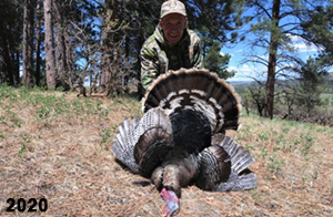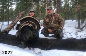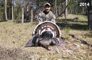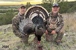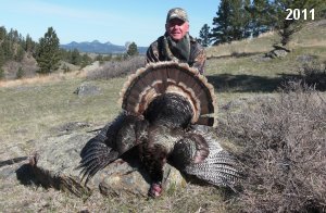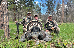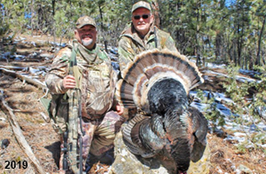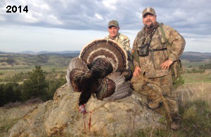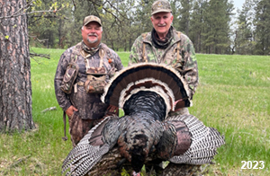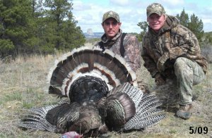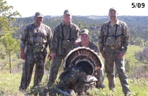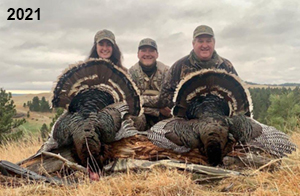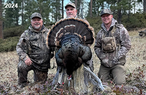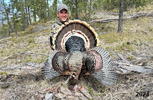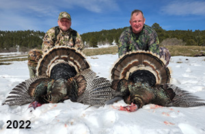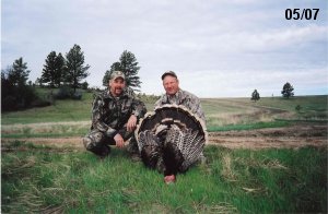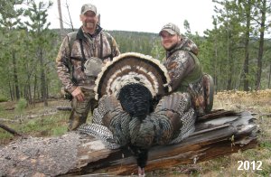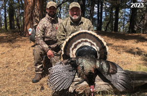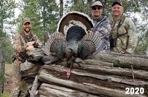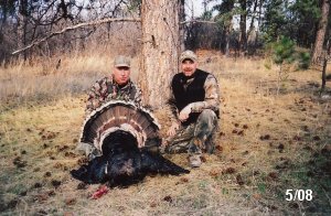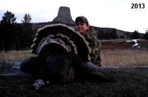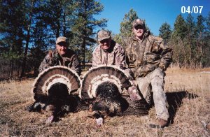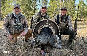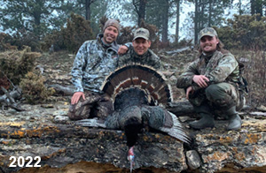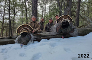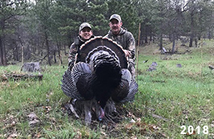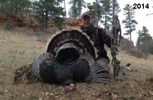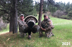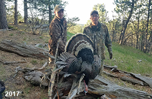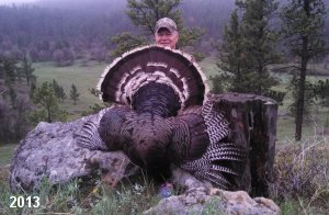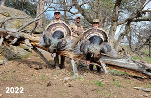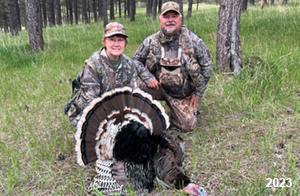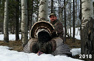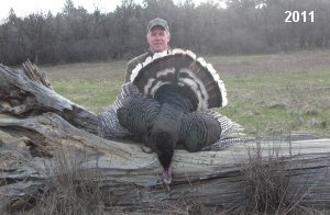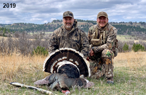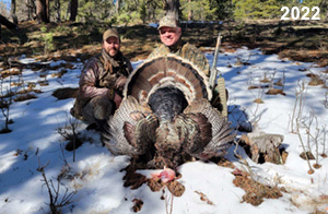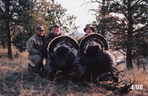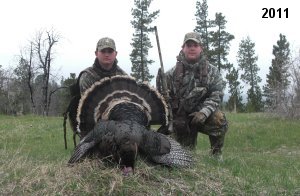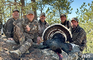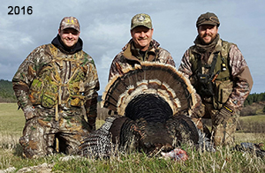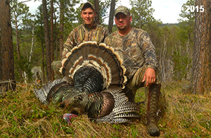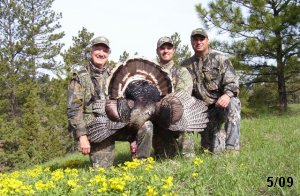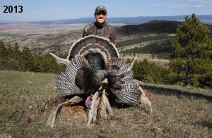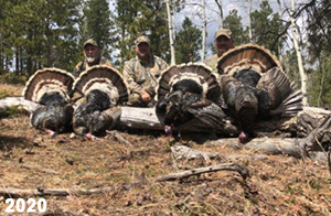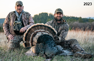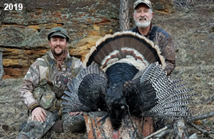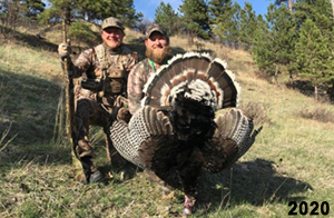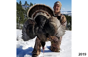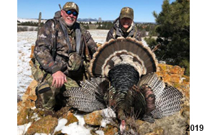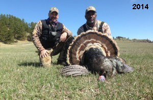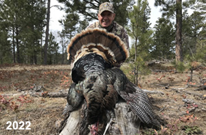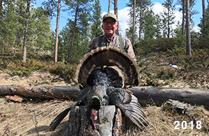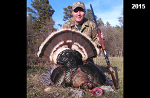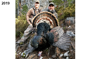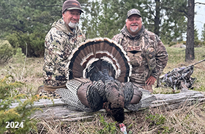 Spring Turkey Our season runs April 20 through May 31. Hunts are three days for single-bird hunts and four days for two-bird hunts. Call or e-mail for specific dates. We assist with obtaining the licenses in Wyoming and South Dakota. Licenses will be at the Lodge when you arrive in the Spring. Over the past 30 years our hunters have had excellent success on long-bearded birds. Our big leases hold excellent numbers of Merriams. Combined with very little hunting pressure, this makes for excellent calling opportunities on mature gobblers. 2025 was an amazing spring turkey season! We took 84 turkey hunters who harvested 76 Merriam Toms. However, shooting opportunity was 98% for our hunters this spring. Out of our 84 turkey hunters, 32 chose to hunt the second Meriam option. Twenty-two of these hunters were successful in harvesting their second Merriam Tom. We have had excellent hatches over the past three years, and we anticipate another outstanding season in 2026. Our 2024 season went awesome! We took 90 hunters who harvested 72 Merriam Toms. 43 of these hunters hunted the second bird in South Dakota. 30 of these harvested a second gobbler. With the excellent hatches the past couple of years, we had an extraordinary amount of jakes this spring. With the overabundance of jakes grouped up, this caused the mature gobblers to gobble much less than normal. We anticipate, after seeing the number of jakes, an exceptional turkey season in Spring 2025. The 2023 season was very successful. We took 92 hunters who harvested 86 Merriam Toms. 34 of the hunters hunted the second bird in South Dakota. 26 of them harvested a second gobbler. The 2024 season looks very promising due to really good hatches in the last few years and really great numbers of jakes that were around during this past 2023 season. The 2022 season went great! We took 88 hunters who harvested 84 Merriam Toms. 44 of these hunters chose to do the second bird hunt in South Dakota. 19 of these harvested a second gobbler. Our 2021 season went well. Because of the virus and 2020 season rollover, we took in the most hunters we've ever had. 95 hunters harvested 88 birds in Wyoming. Hunters who chose to hunt the second bird in South Dakota were around 50% harvest. Throughout the season, we saw large numbers of jakes. The 2020 season was a bit challenging. Due to the virus restrictions, we cancelled the April hunts and all April hunters were given the opportunity to move into 2021 or come in May. We were able to hunt 46 hunters in May. These hunters harvested 42 mature Merriam toms. 35 of these hunters were on the two-bird combo, and 28 of them were able to harvest the second bird. The 2019 season had good success considering cold snowy conditions throughout most of the season. 88 hunters harvested 78 mature toms. 57 of the hunters chose to hunt the second bird; they harvested 41 toms. There were A LOT of missed birds this year, over 50. Although we had poor weather in May, it got better at the end of the month and we ended up with a tremendous hatch. 2018 spring turkey season was awesome! We had 82 turkey hunters and harvested 78 birds. 55 of these hunters chose the two-bird hunt. 48 of them harvested their second Merriam tom. Again, this year we had over 50 misses. We are seeing a lot of jakes and had another good hatch. |